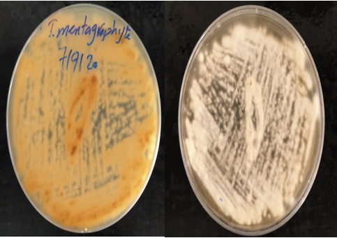 Figure 4.Macroscopic appearance of M. Canis on potato dextrose in a falcon A) Bright yellow reverse pigment B) white, fluffy with areal mycelium surface; Macroscopic appearance of T. Mentagrophytes on Sabouraud dextrose agar plate C) colorless, yellow brown reverse pigment and D) white creamy granular surface.